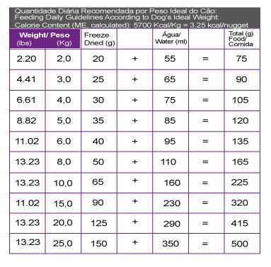 Para oferecer como alimento seco, consultar a coluna “Freeze Dried (g)” na tabela orientadora, para confirmar a quantidade de alimento a disponibilizar, de acordo com o peso corporal ideal do animal. Para oferecer como alimento húmido reconstituído, consultar as colunas “Freeze Dried (g)” e “Água (ml)” na tabela orientadora, para confirmar a quantidade de água morna necessária para reconstituir o alimento a disponibilizar, de acordo com o peso corporal ideal do animal. Aguardar cerca 15m a 30m antes de servir ou triturar para formar patê.